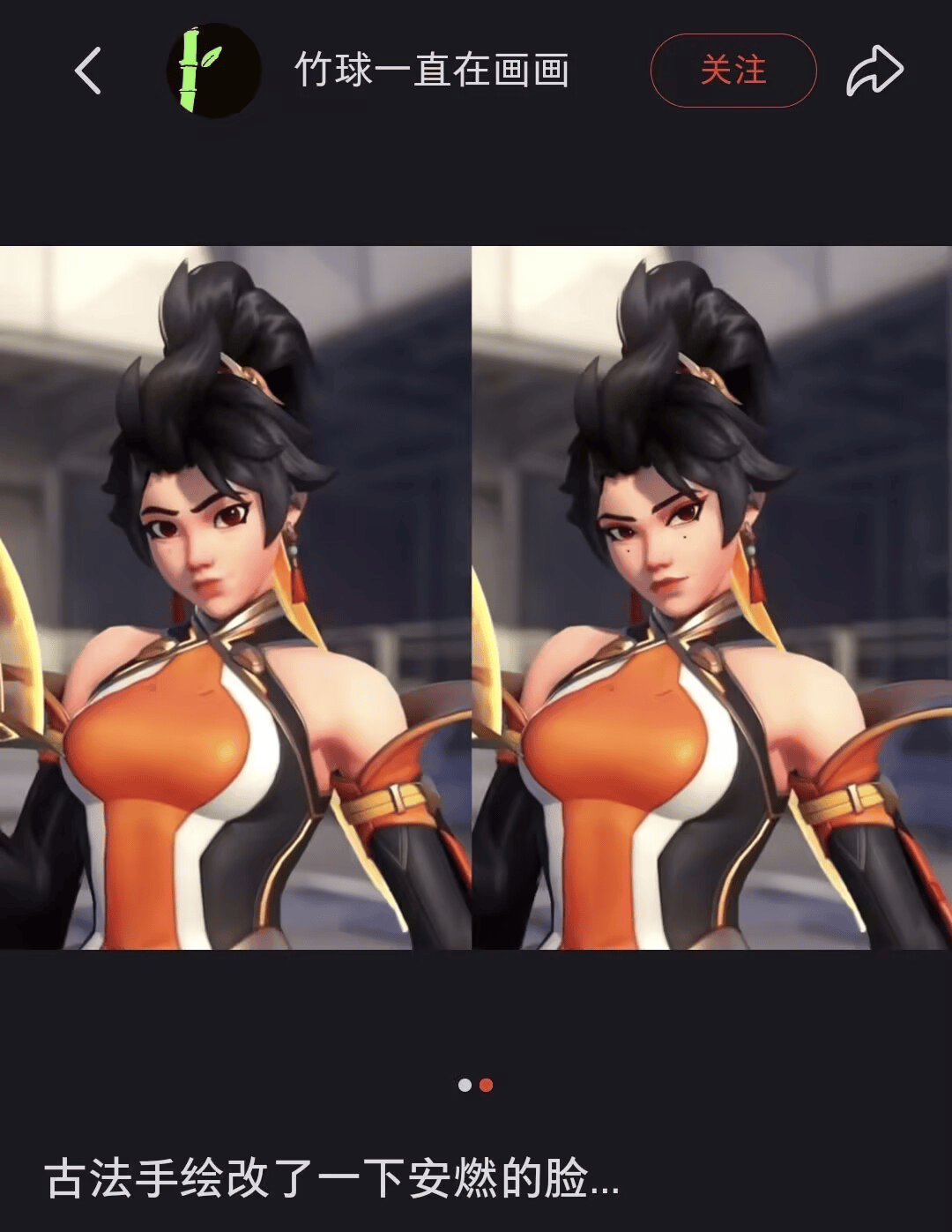 其实,在“安燃”角色形象公布后,国内的《守望先锋》社区,也产生了一些关于“安燃脸模要不要改得更英气一些”的相关讨论。就比如上面那个被拿来和“索尼克”联系的改图,就出自小红书用户“竹球一直在画画”之手。