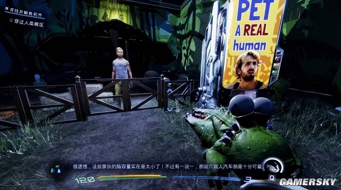 虽然游戏故事的整体基调宏大而又严肃,但《高能人生 2》实际的战斗环节与剧情演出,却依旧由一个个段子式的幽默桥段组成。在本作戏谑的黑色幽默之下,主线中那些关乎人类种族的生存危机,实际也有了更多乐子。比如在序章中,你将会遭遇类似动物保护组织的外星“人保”集会,也会屡屡走进外星人专设的“人类展览馆”,听到各种令人哭笑不得的“人类笑话”: