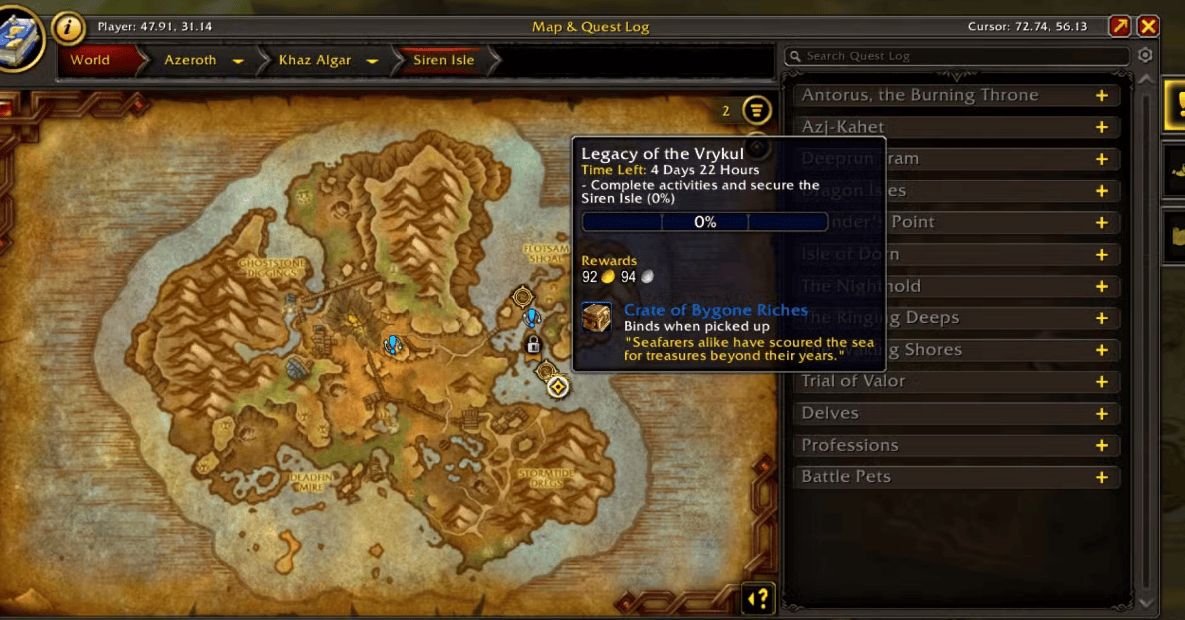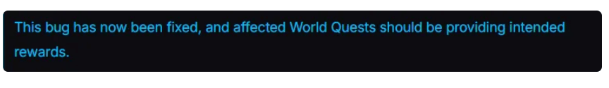 《魔兽世界》在2月10日发布前夕的第二个补丁,为3月3日的正式版做准备,邪DK和噬灭恶魔猎手获得调整。然而此更新也带来新的Bug,影响特定区域一些世界任务的奖励。例如多恩岛和卡雷什,以及巨龙军团的某些地图,如觉醒海岸和欧恩哈拉平原。当鼠标悬停在地图上受影响的世界任务上时,奖励列表中原本应该显示金币奖励的位置现在为空白。不过,其他奖励,如勇气石、共鸣水晶和装备等,不受影响。