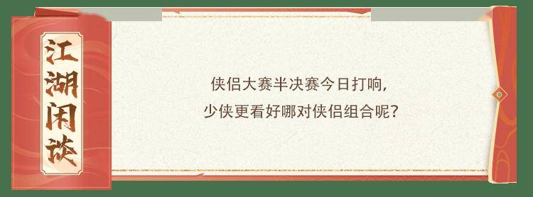 侠侣大赛,锋芒尽显!一对对侠侣并肩而立,以剑为盟、以心为契,每一场对战都惊心动魄、扣人心弦。今日半决赛,更是强者之争——既有横空出世、势头正盛的黑马侠侣,也有久经江湖、实力超群的老牌强者,究竟谁能更胜一筹,顺利晋级总决赛?让我们屏息凝神,拭目以待!