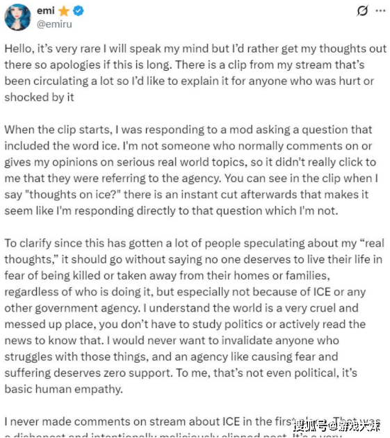 Emiru后续发长文澄清,强调剪辑误导、说明自己并未站在仇恨一方,也划清所谓“交友问题”的界限。这并非一次政治宣言,而更像是对粉丝情绪的安抚,她甚至坦言,并非想说服所有人,只是希望那些感到不安的人明白她没有恶意。这样的回应,本身已是一种克制。