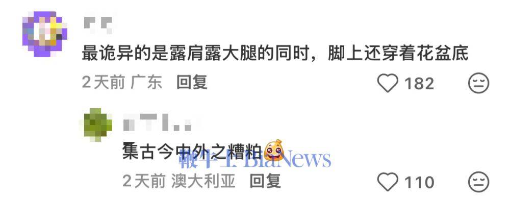 还有网友直言道,“好诡异啊,上半身是清代保守服饰,下半身是现代清凉超短裙......”