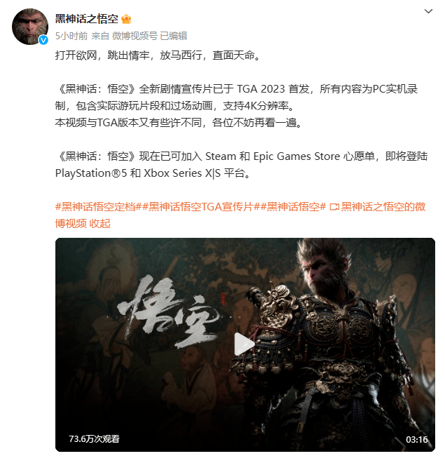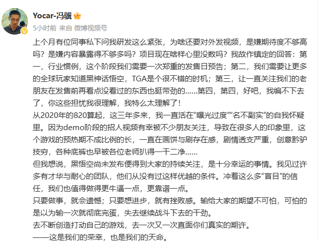 “上个月有位同事私下问我研发这么紧张,为啥还要对外发视频,是嫌期待度不够高吗?是嫌内容暴露得不够多吗?项目现在啥样心里没数吗?我故作镇定的回答:第一,行业惯例,这个阶段我们需要一次郑重的发售日预告;第二,我们需要让更多的全球玩家知道黑神话悟空,TGA 是个很不错的时机;第三,让一直关注我们的老朋友在发售前再看点没看过的东西也挺带劲的…… 第四,第四,好吧,我编不下去了,你这些担忧我很理解,我特么太理解了!