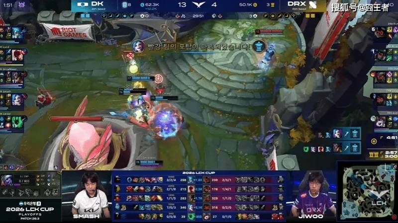 结果第四局比赛,比DK打成了碾压局。5分钟:LCK:Lucid蔚抢下小龙,DK追击收掉DRX双人组打出零换二;14分钟:DK先手开团被烈娜塔反打,加里奥大招落地收掉洛的人头;15分钟:DK抢下先锋随后分割战场追击打出零换二;24分钟:双方围绕大龙爆发团战,DK先行击杀对方ad后追击收掉上中二人打出零换三;26分钟:DK携大龙buff推上高地一波结束比赛。