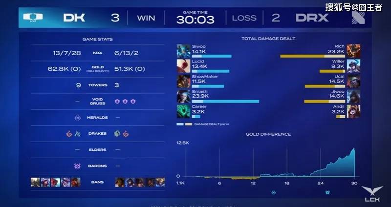 结果决胜局,DRX仅打了开场10分钟好局,后续时间,被DK碾压。3分钟:DRX越塔强杀格温但是兰博也被对方换掉;8分钟:Rich兰博起手高温q接大招,随后闪现跟输出击杀Siwoo拿下单杀;12分钟:DK拿下小龙后追击击杀对方野辅打出零换二;22分钟:格温盲僧gank兰博但是兰博丝血逃脱,金克丝精准飞弹收下人头;23分钟:Siwoo格温越塔追击一套单杀Rich兰博;29分钟:双方中路爆发团战,金克丝启动无人能挡配合队友拿下四杀一波结束比赛。