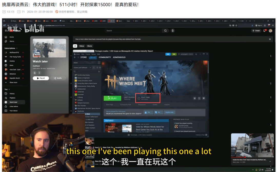 各路海外知名KOL甘当自来水,纷纷主动带货,其中北美知名主播挑眉哥对于燕云更是赞不绝口,甚至放出自己511个小时的游玩时长,只为证明自己是真爱。