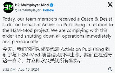 但在宣传片发布后仅五个小时,Mod作者就在推特发布声明,表示该Mod已取消。原因是他们收到了来自发行商动视的禁令,他们选择遵守这个命令,立即永久关闭所有业务。