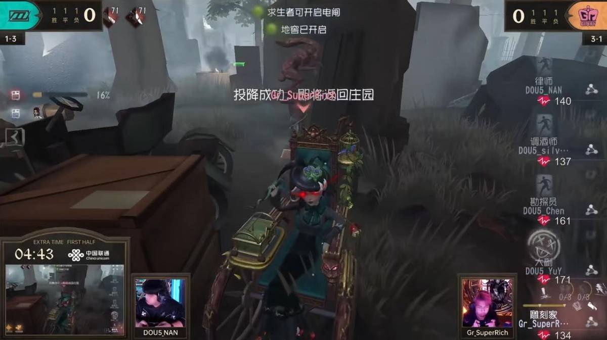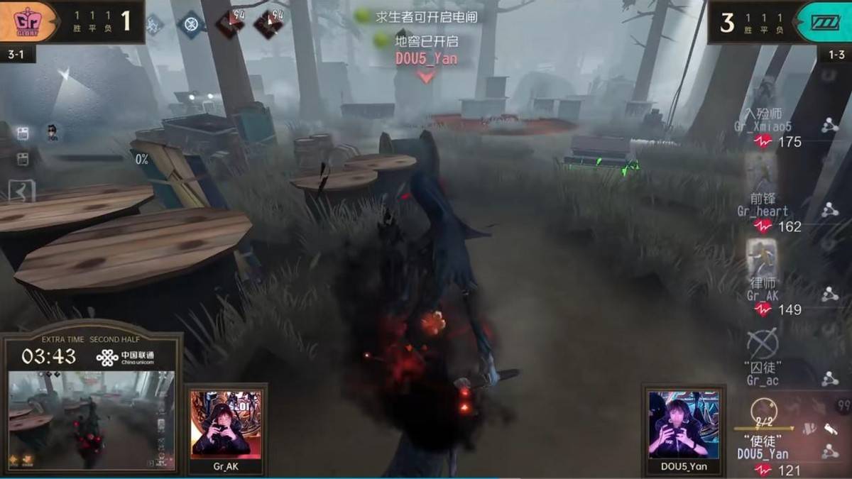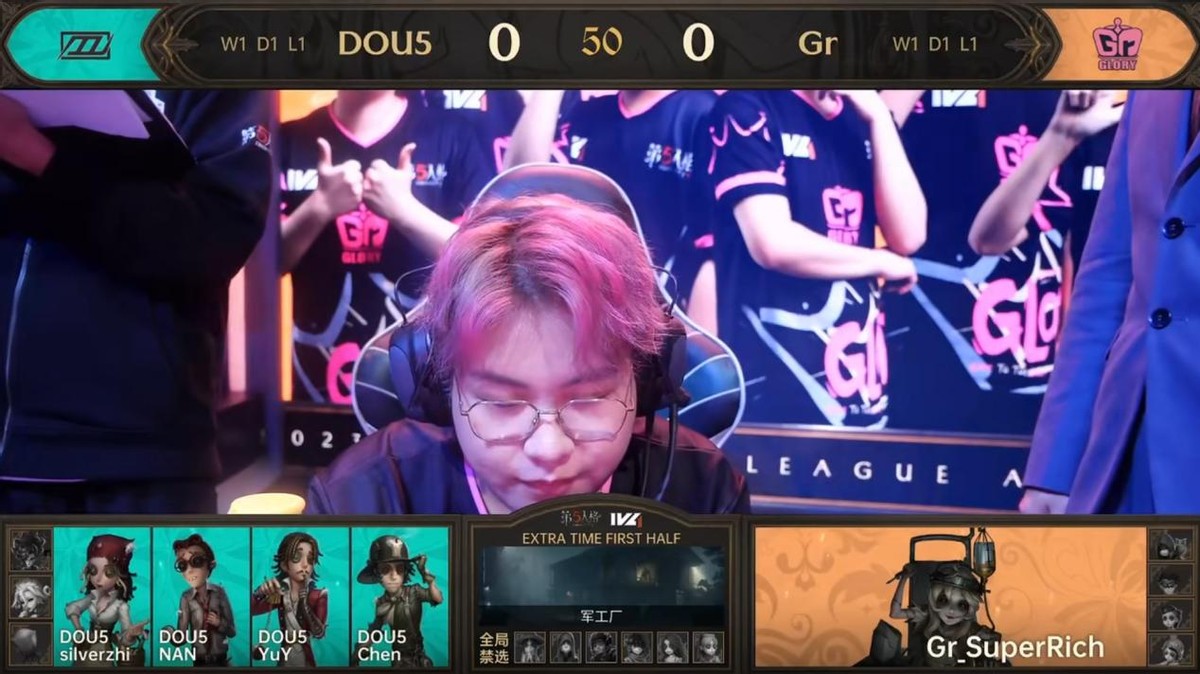 第三局比赛Gr战队和DOU5战队以4:4战平,第四局比赛地图为军工厂,这张地图是求生者偏优势图。