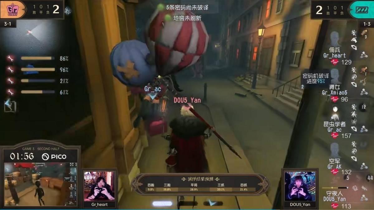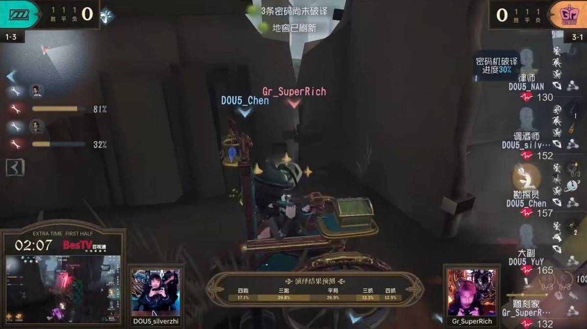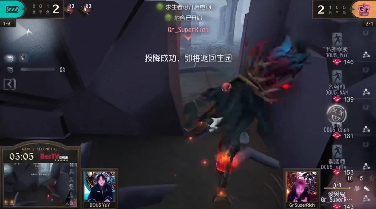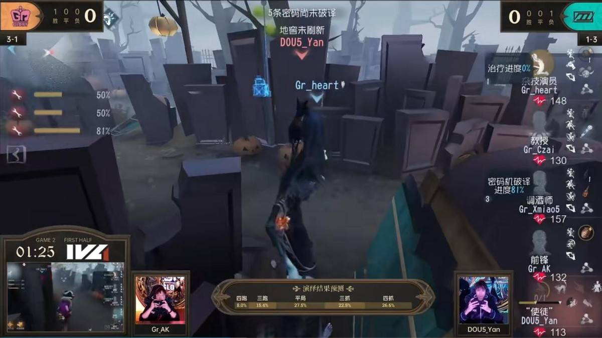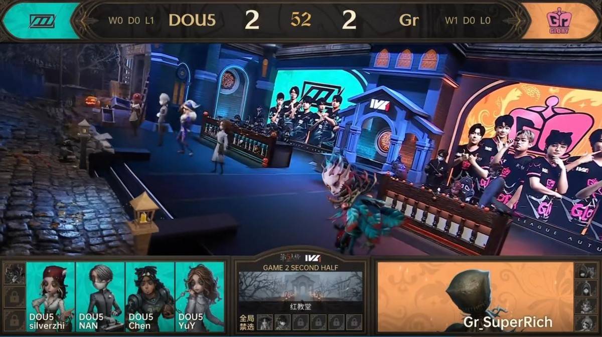 第一局比赛Gr战队以5:3的优势领先DOU5战队,第二局比赛地图为红教堂,这张地图是求生者偏优势图。