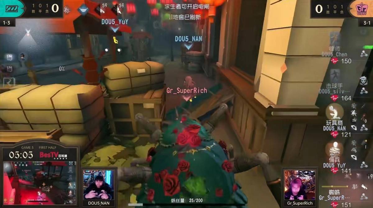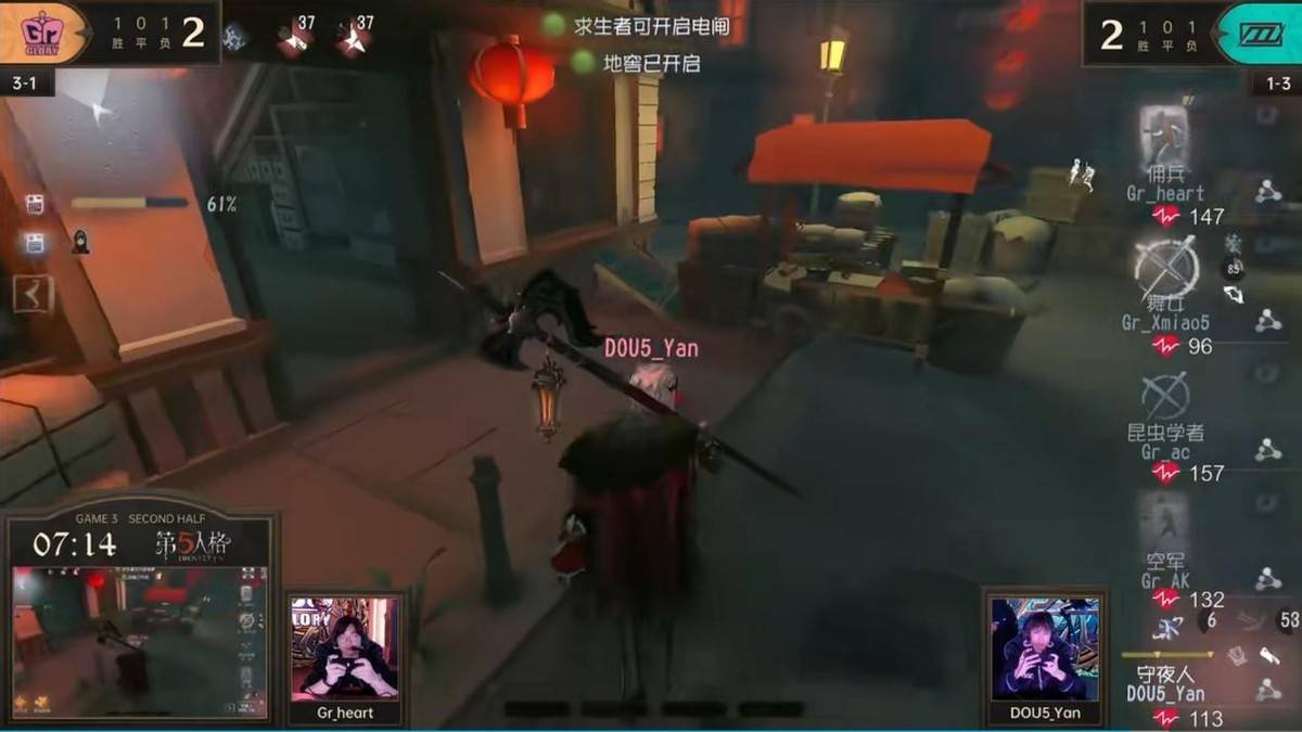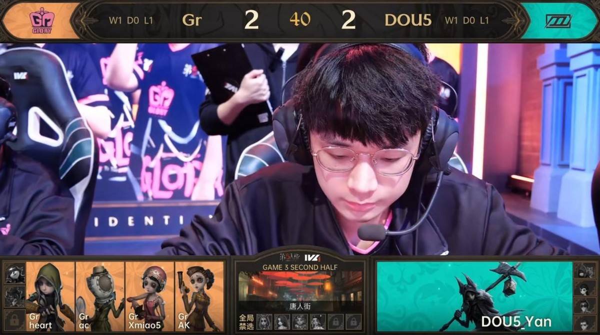 第二局比赛DOU5战队以5:3的优势领先Gr战队,第三局比赛地图为唐人街,这张地图是求生者偏优势图。