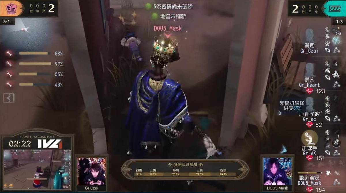 第一局比赛Gr战队以5:3的优势领先DOU5战队。上半轮监管者追击祭司被击倒并上椅。大副扛刀救下。淘汰祭司开门战监管者选择追击园丁,其余求生者安全出门。最终双方2抓2出战平。下半轮监管者追击击球手将其击倒并上椅,野人扛刀救下。开门战监管者选择追击击球手,其余求生者安全出门,最终求生者3出获胜。