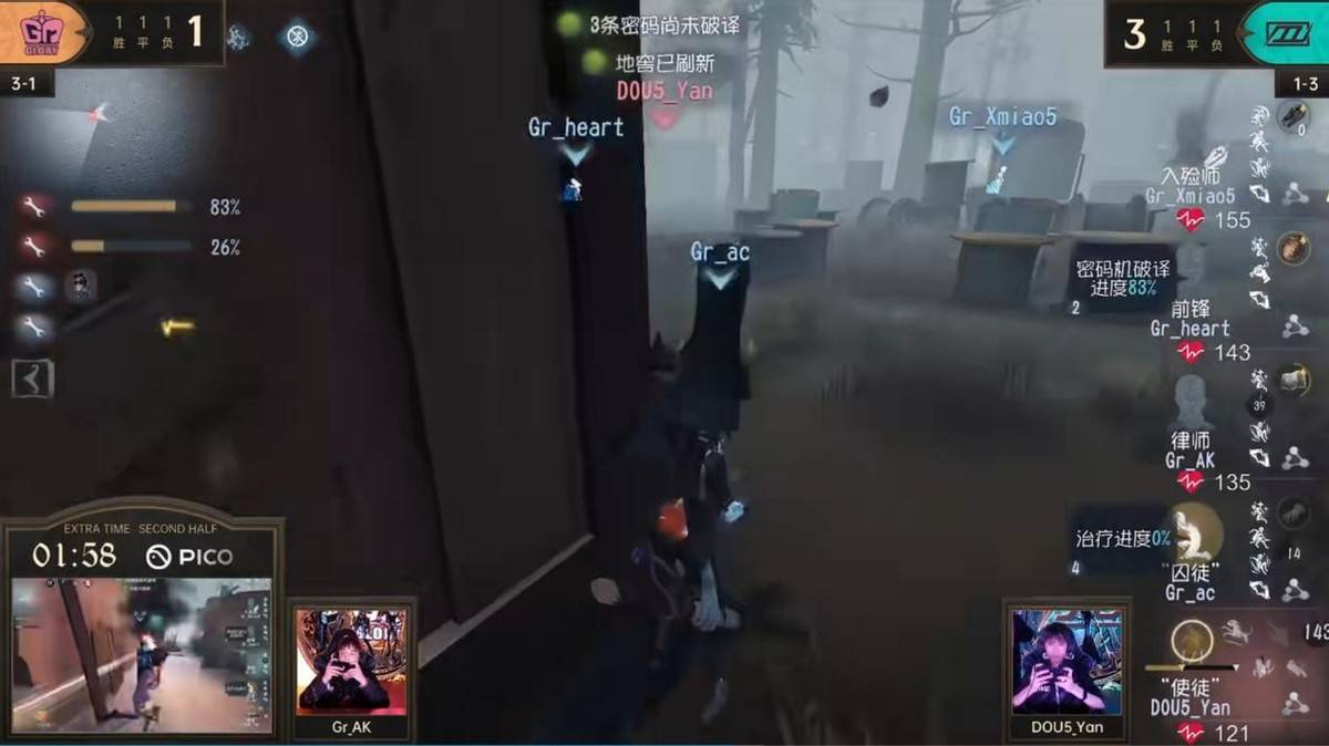 求生者Gr战队——Ban:歌剧演员 梦之女巫 记录员Pick:Gr_AK律师 Gr_Xmiao5入殓师 Gr_heart前锋 Gr_ac囚徒