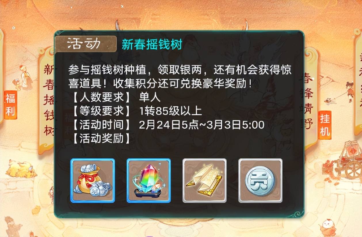 每年春节活动,我最喜欢的就是摇钱树,在大话手游这里,你只需要参与摇钱树种植,就能领取到银两,还有机会获得惊喜道具,当然啦,获得的积分可以兑换豪华奖励。