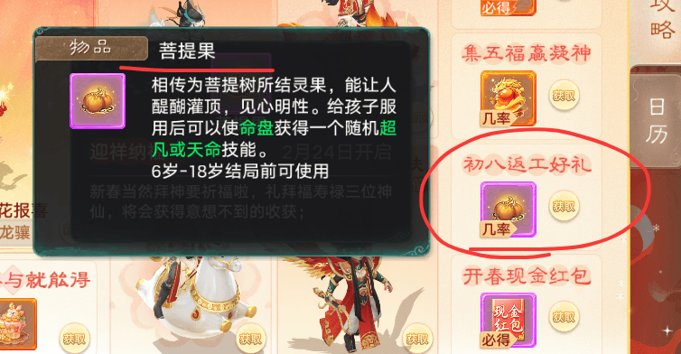 初八拜福禄寿三位神仙,这是咱们中国人的传统,在大话里面当然也没有例外了,迎祥纳福可得菩提果,给孩子服用后可以使命盘获得一个随机超凡或天命技能。
