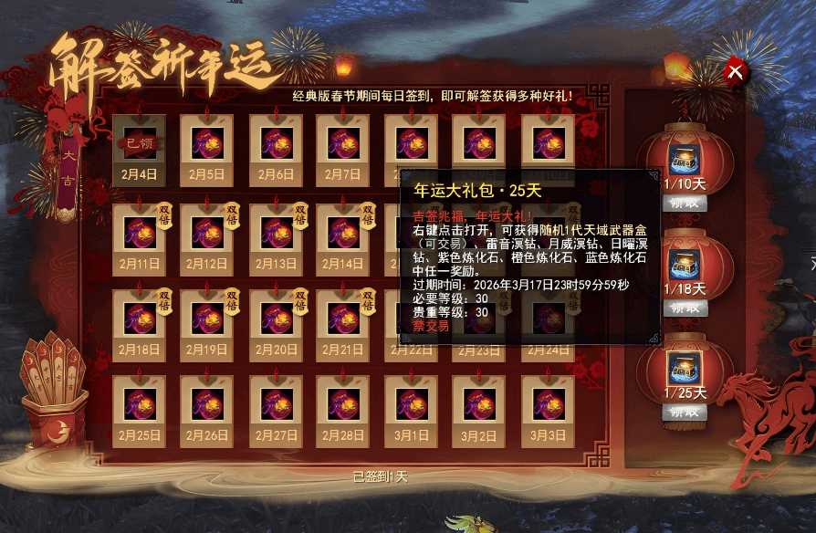 如果实在懒得动,你只需在2月4日至3月3日上线签到25天,就有机会拿到可交易的随机1代天域武器盒,轻松躺赢。除此之外,2月11日左右还会公布新春版本具体信息。就《天下贰·经典版》现在的玩家基数,只要它出的东西和材料、金价有关,闭眼入就行。如果亏了,自有大儒为你发声。你还可以选择加入《天下贰·经典版》玩家群,里面的人个个都是人才,说话还好听,加入之后如果你遇上什么问题,都不怕没有人来为你出谋划策。