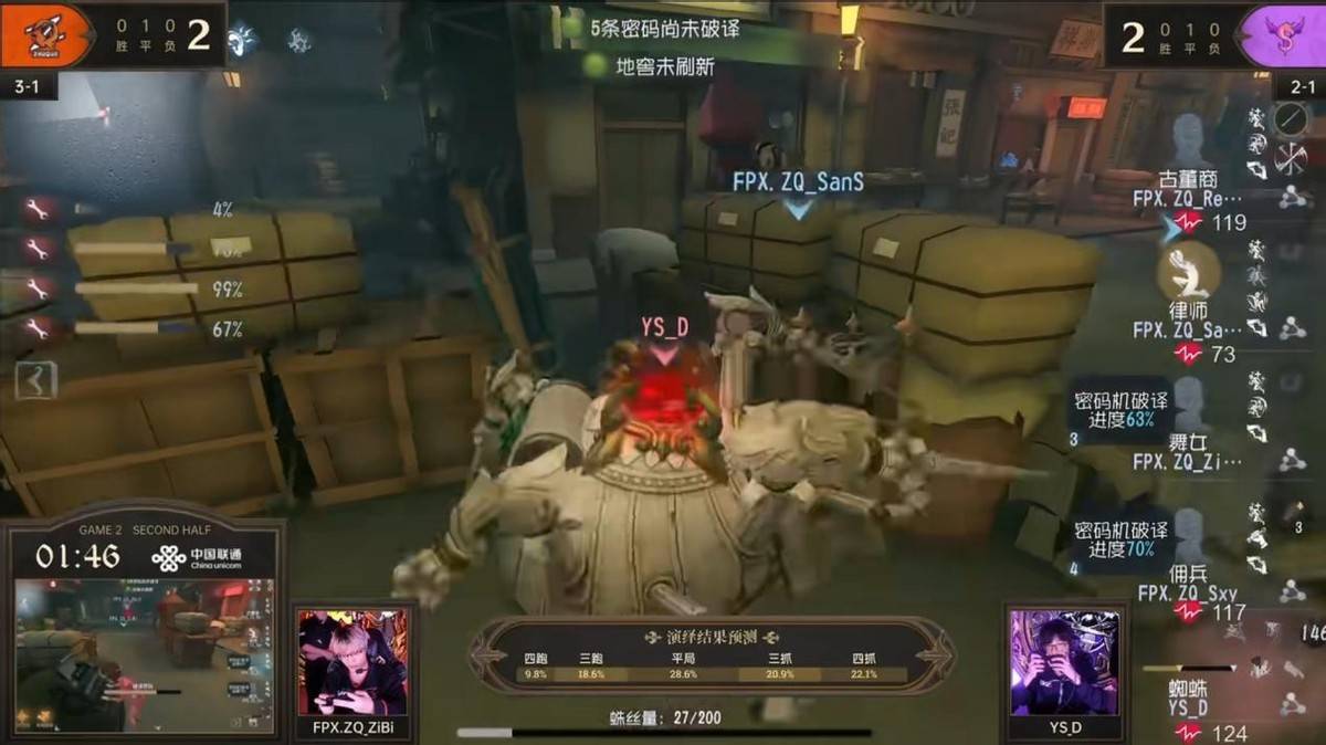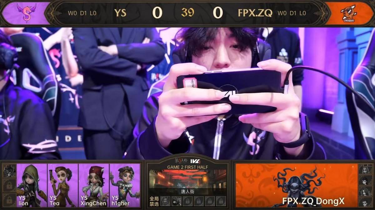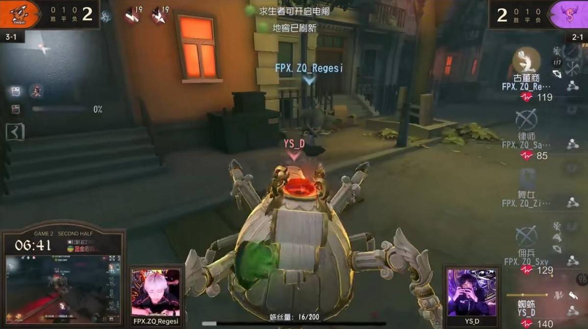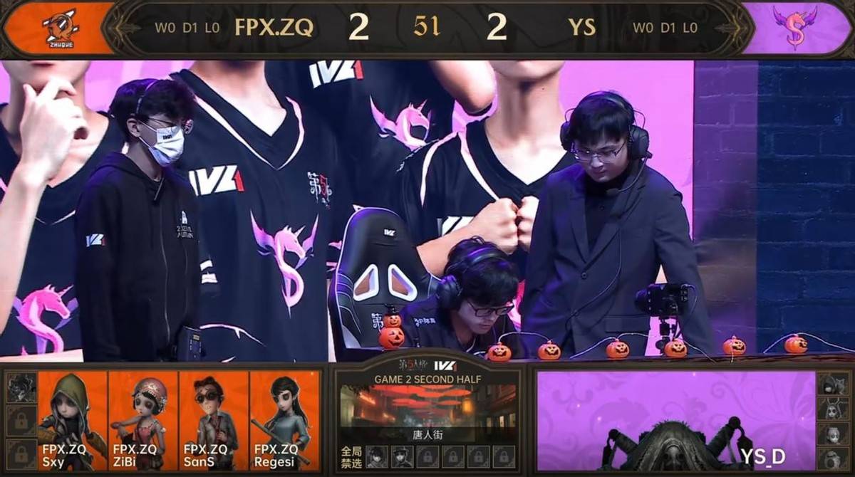 第一局比赛FPX.ZQ战队和YS战队以5:5战平,第二局比赛地图为唐人街,这张地图是求生者偏优势图。
