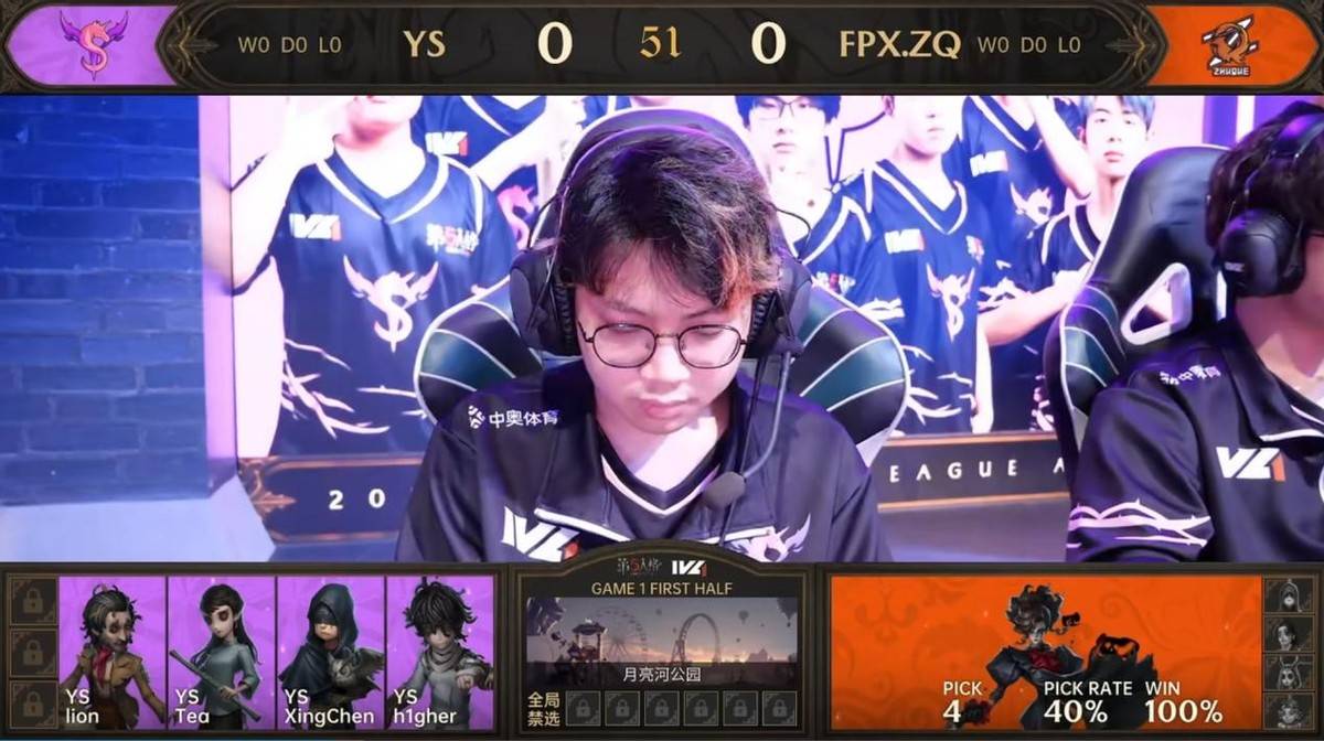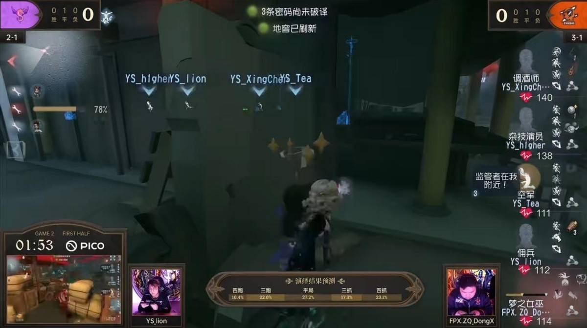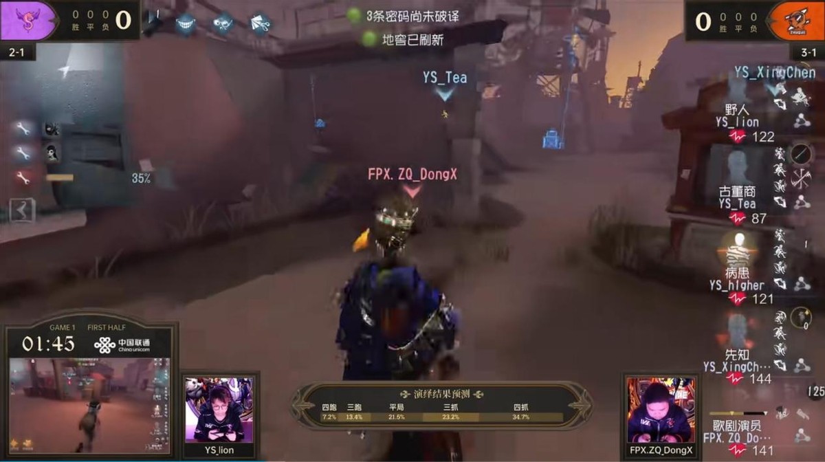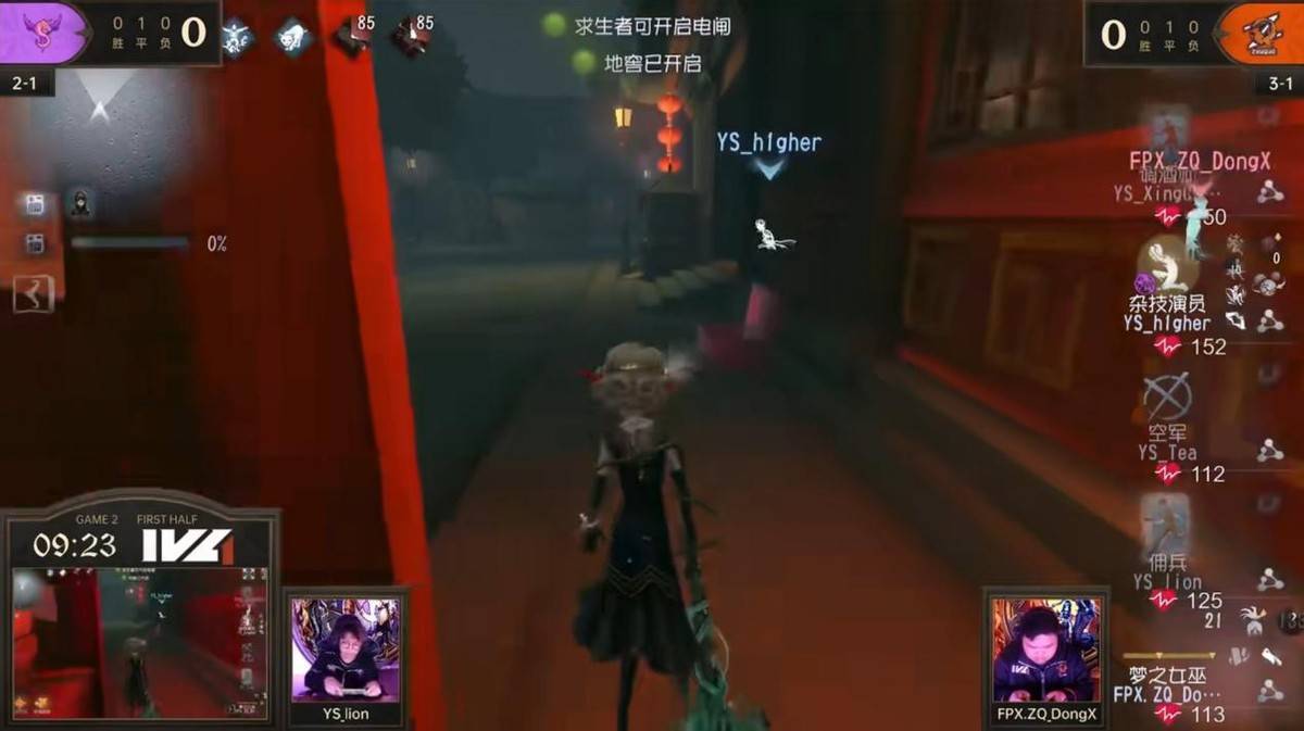 第一局比赛FPX.ZQ战队和YS战队以5:5战平,第二局比赛地图为唐人街,这张地图是求生者偏优势图。