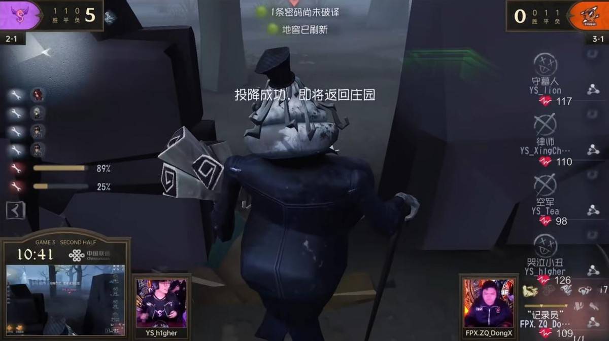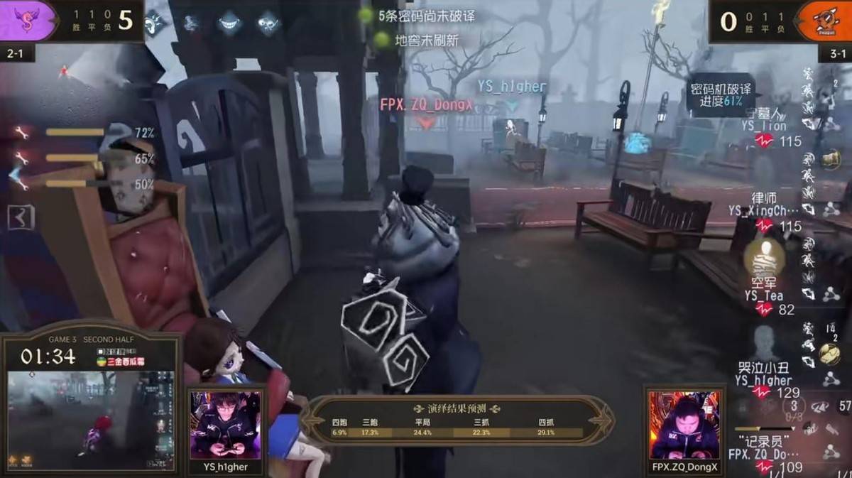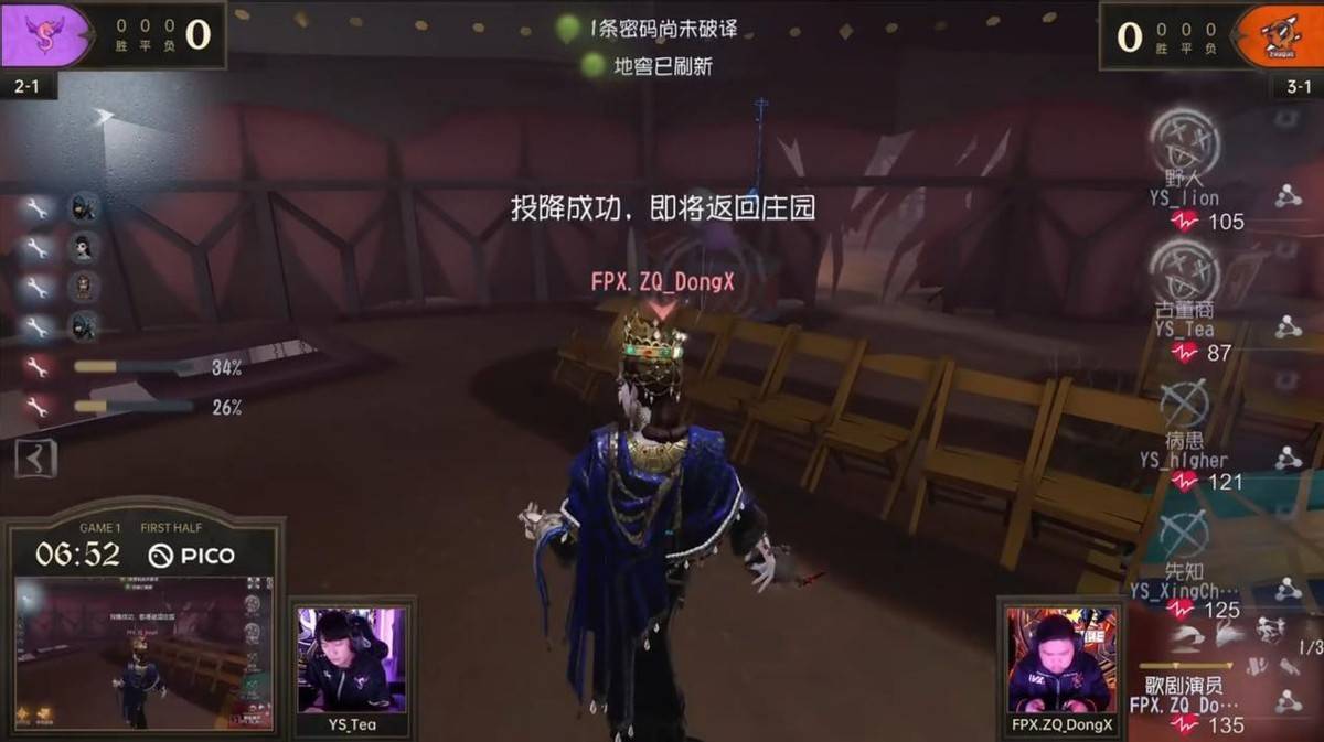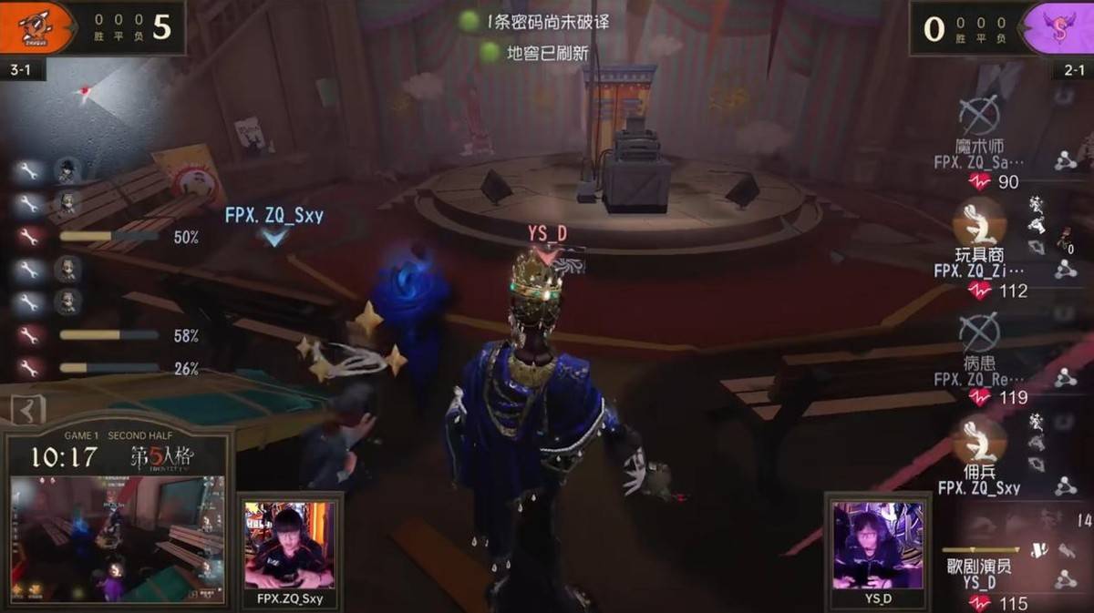 求生者FPX.ZQ战队——Ban:歌剧演员 Pick:FPX.ZQ_sxy佣兵 FPX.ZQ_Regesl古董商 FPX.ZQ_ZiBi舞女 FPX.ZQ_SanS律师