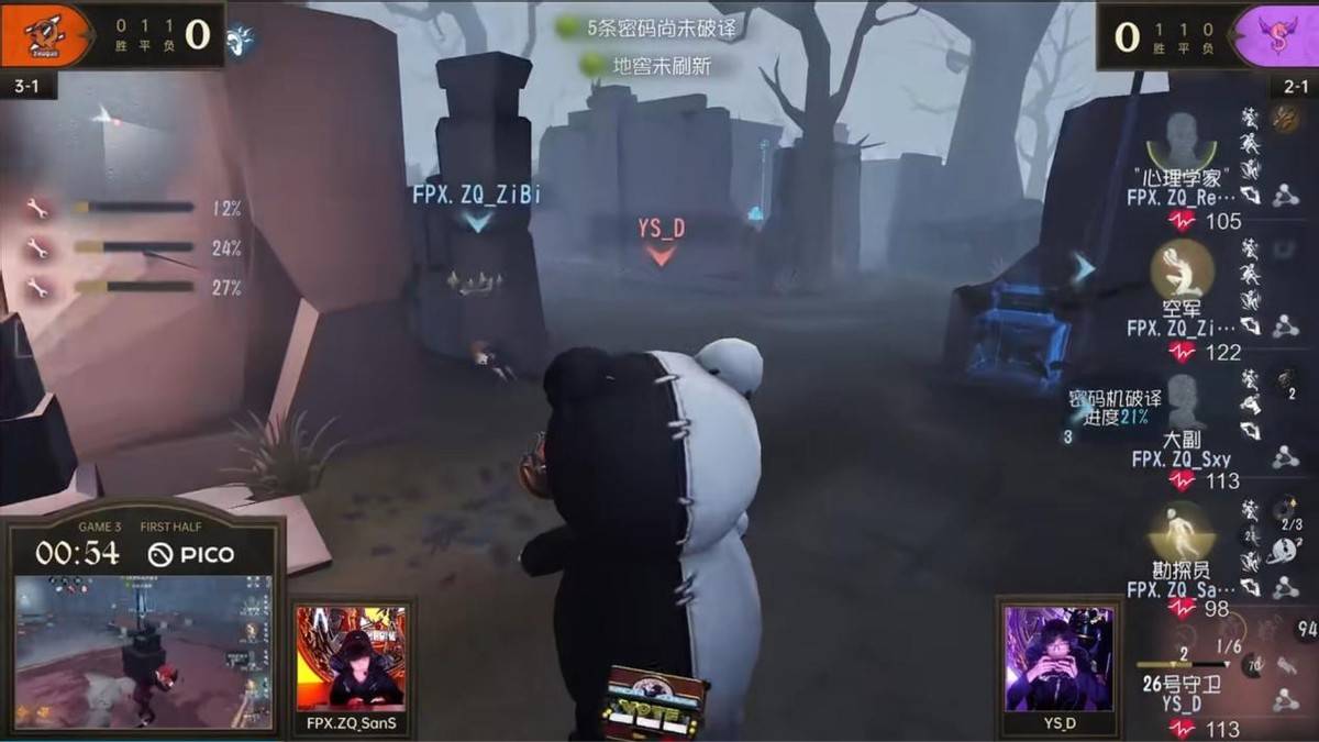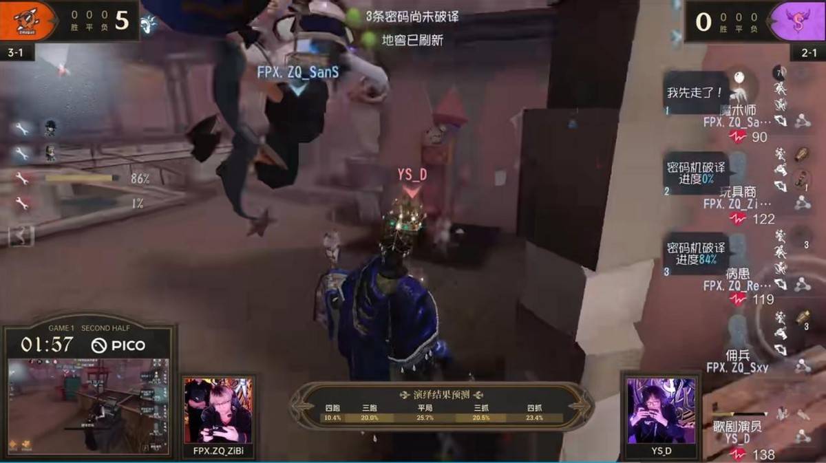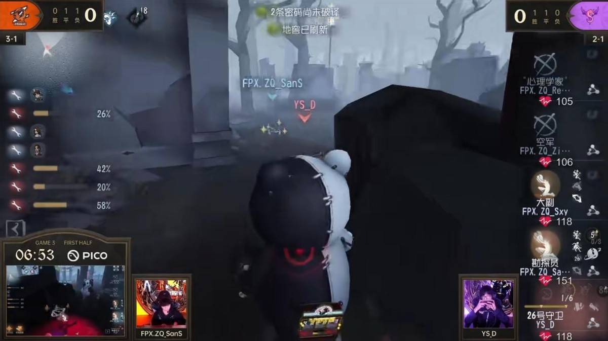 求生者FPX.ZQ战队——Pick:FPX.ZQ_sxy佣兵 FPX.ZQ_Regesl病患 FPX.ZQ_ZiBi玩具商 FPX.ZQ_SanS魔术师