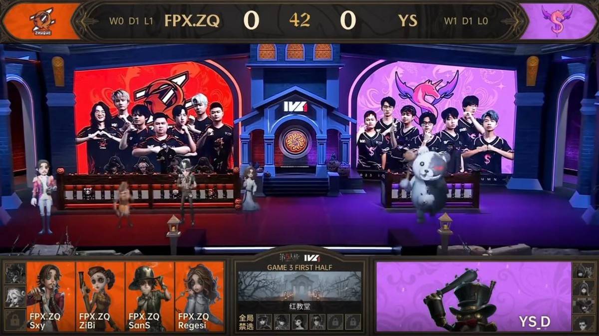 求生者FPX.ZQ战队——Ban:歌剧演员 红夫人Pick:FPX.ZQ_sxy大副 FPX.ZQ_Regesl心理学家 FPX.ZQ_ZiBi空军 FPX.ZQ_SanS勘探员