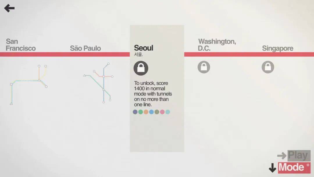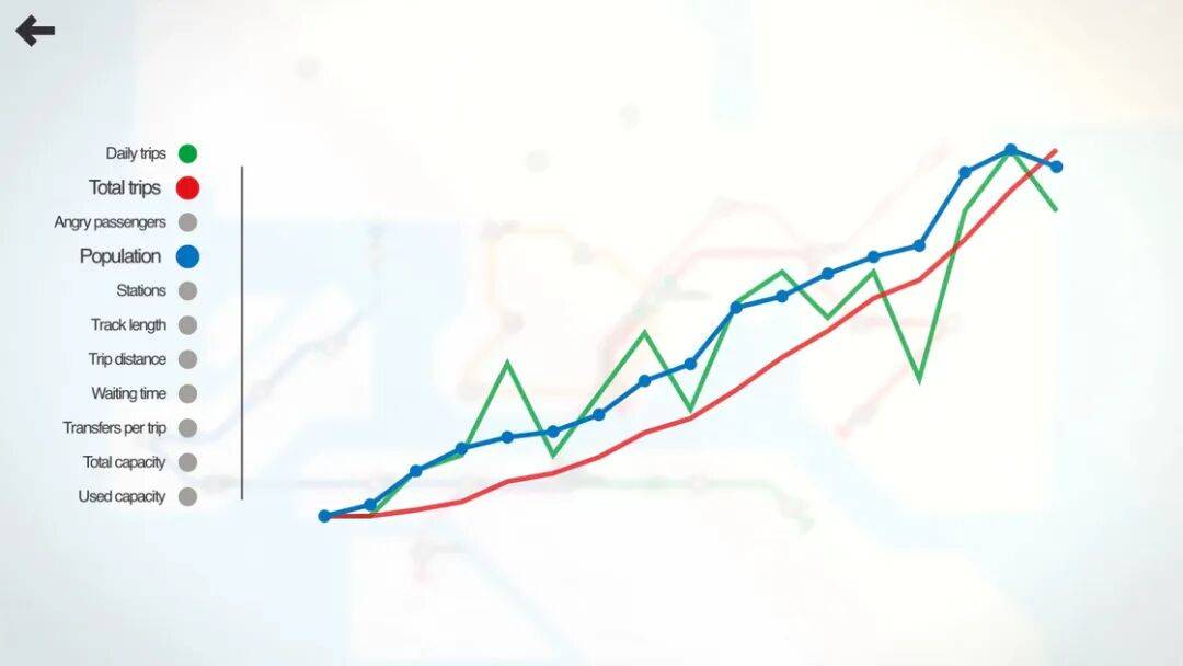 游戏会选取现实中有地铁的城市,依实际人流与状况不断开通站点,玩家需要依需求将站点连接成不同线路,最终形成一张满足运力要求且能稳定运行的地铁线路图。想玩得好,Mini Metro 也算是费时费力,需要不断调整策略,不能让运力不足,也不能在资源稀缺的状态下运力虚空,如果站点积压的乘客过多会跳出倒计时,倒计时结束则游戏结束。