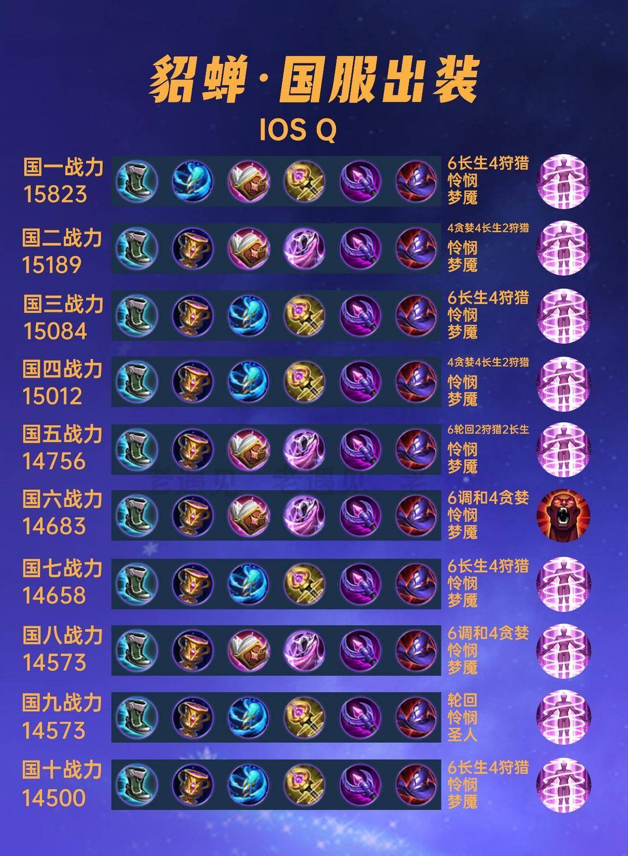 有的国服选择了输出能力更强的日暮之流,有的国服选择了坦度更高的不祥征兆,甚至再搭配一个不死鸟之眼,这就牵扯到出装上怎么去把握输出和坦度的平衡。貂蝉的是三大真伤英雄之一,自身对于输出能力的需求并不是特别大,不像是其他法师一样又是博学者之怒又是贤者天书又是法穿装备,貂蝉需要的是冷却缩减,回蓝,回血和一定的坦度。
