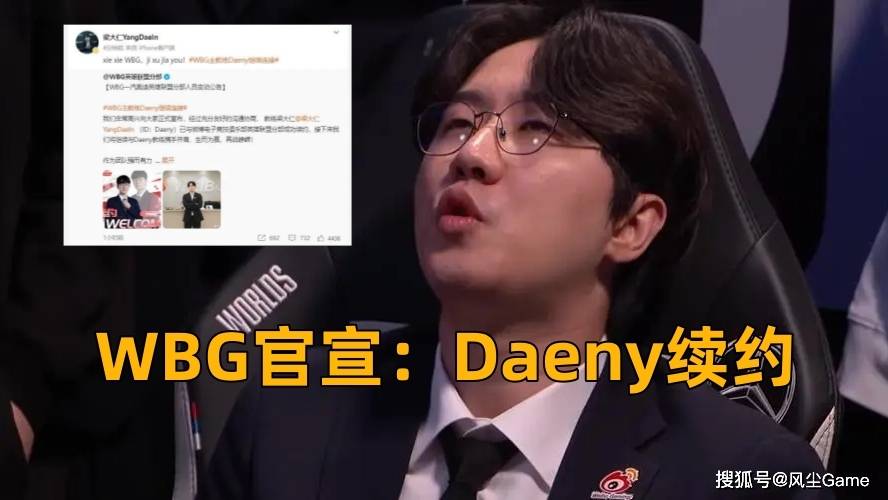 距离转会期仅剩3天的情况下,WBG管理层终于是想通了,在12月8日,正式发文官宣Daeny续约成功,而丹神也发微博表示:谢谢WBG,继续加油,WBG这支队伍,说实话确实离不开丹神,教练BP能力不差,执行力强大,这才是是WBG能够在世界赛,拿到亚军的关键。