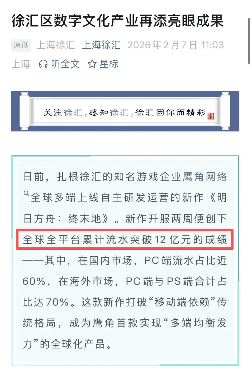 此前,上海徐汇官方发布官方披露信息显示,鹰角网络旗下该产品上线两周内。