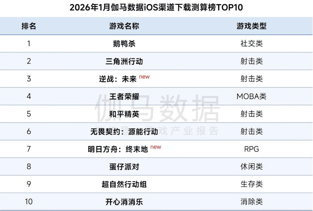 在境外市场方面,2026年1月重点海外市场产品流水增长TOP10中,决胜巅峰位列榜首,“明日方舟”IP两款产品同步入榜。