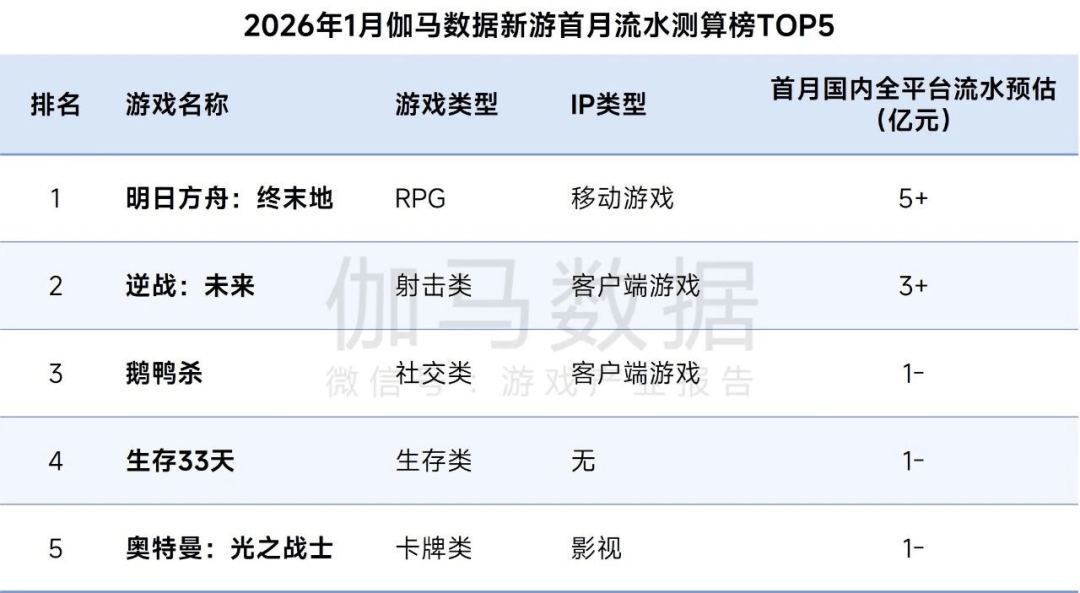 1月新游首月流水测算中,终末地以5亿流水领跑榜单,随后的分别是腾讯的《逆战:未来》、金山代理的《鹅鸭杀》国服、三七的《生存33天》和凯撒文化的《奥特曼:光之战士》。