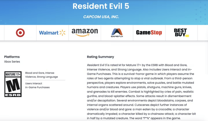 2025年末,曾有舅舅党爆出卡普空会在《生化危机9》发布后,快速公布《生化危机5》重制版的消息。近日,游戏媒体 Kotaku 实锤了这一消息的可靠性,称卡普空旗下游戏《生化危机5》的Xbox Series版本出现在美国分级机构ESRB官网上。