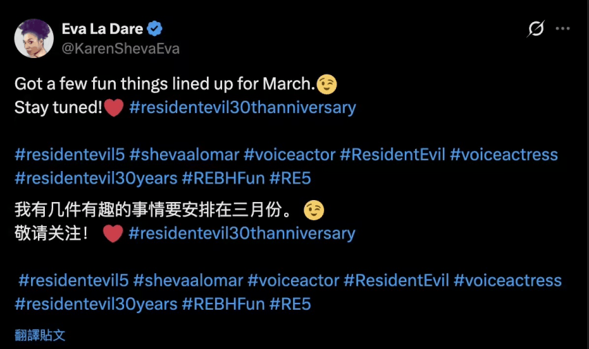 此外,为《生化危机5》中谢娃·阿洛玛配音的演员Eva La Dare上个月在X平台发文表示:“三月将有一些有趣的事情发生,敬请期待!”并在文中附上了“#RE5”“#resident evil5”等标签。
