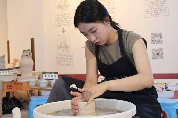 此外,还有汉服走秀、客家山歌、潮州手拉坯、非遗蜡染、玻璃吹制等项目在开幕式现场一一呈现。观澜湖新城广场和手艺工场体验室内游人如织,学非遗、玩非遗、赏非遗,古韵绵长又欢乐的“七夕”从白天延续至夜晚。