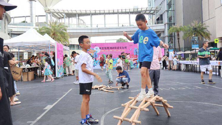 文化周开幕当天正值传统七夕佳节,七夕又名“乞巧节”,而传统手作极能体现和启发巧手妙思。当天,大量身着霓裳华服的汉服爱好者云集在观澜湖新城广场,在印有非遗符号的长卷上信笔作画。同样吸引大众参与的还有非遗漂漆扇体验,只需拿着画笔一阵点、甩、弹再加上浸染等操作后,传统古扇上就呈现出斑斓又抽象的色块,每个作品都独一无二。近几年大火的榫卯木艺引来不少小朋友参与,几根木条就搭起能载重一人的小木桥。