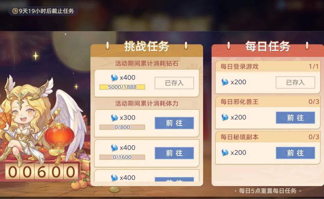 然后存钱罐还包括一个每日活动和限时活动的钻石返还,每日活动最多可以领取到600钻石,看介绍写的10天活动时间便是理论上应该总计6000钻石,接着限时任务则是理论上最多可以获得2300钻石,大家看着两部分加起来应该还算是不少对吧,但实际上这个任务方面官方应该是设置了一个5000钻石的上限,所以存钱罐活动嘛实际大家如果存入5000钻石的话,最高的收益应该是返还的5000钻石+任务上限的5000钻石,总计10000钻石。