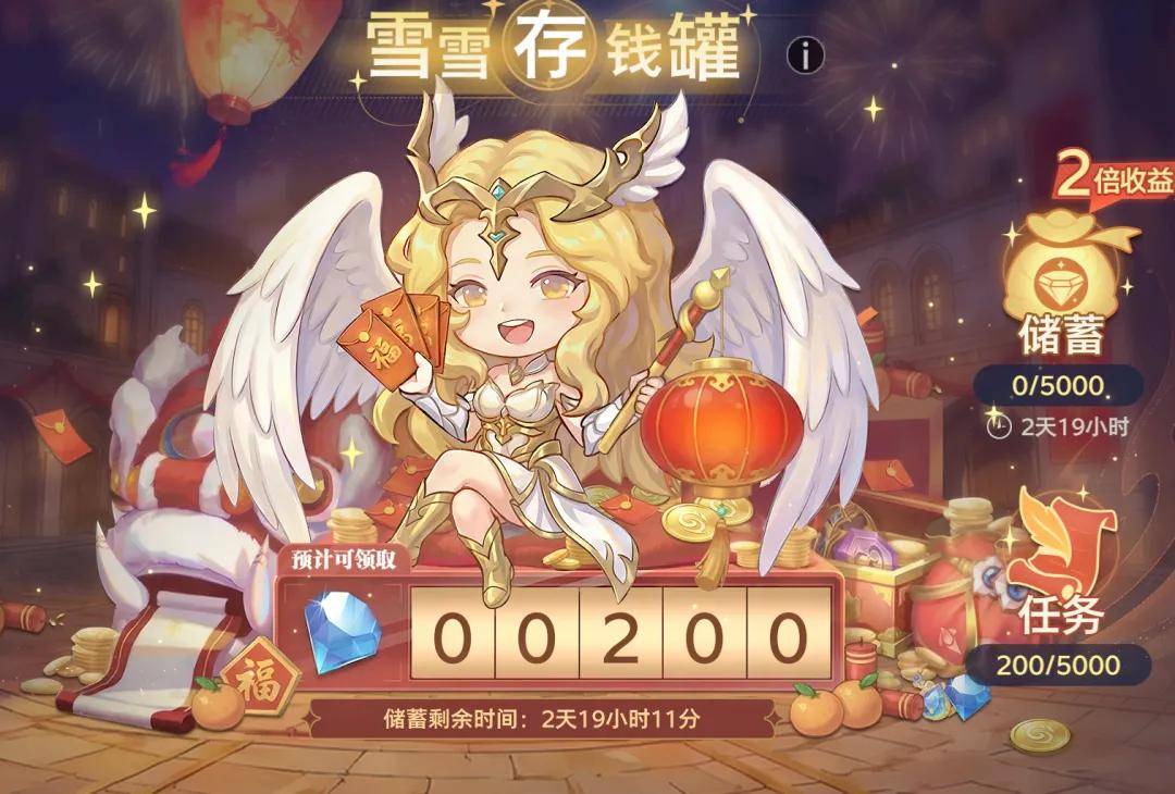 第三个活动则是传说中存钱罐活动,这个活动类型在隔壁魂师对决都已经成为节日标配了,而在咱们这边则是首次上线,首先这个存钱罐最多可以让我们一次性存进去5000钻石,然后在3天后过年时可以领取到2倍的回报,相当于主动存5000就是3天后可以领取10000钻石。