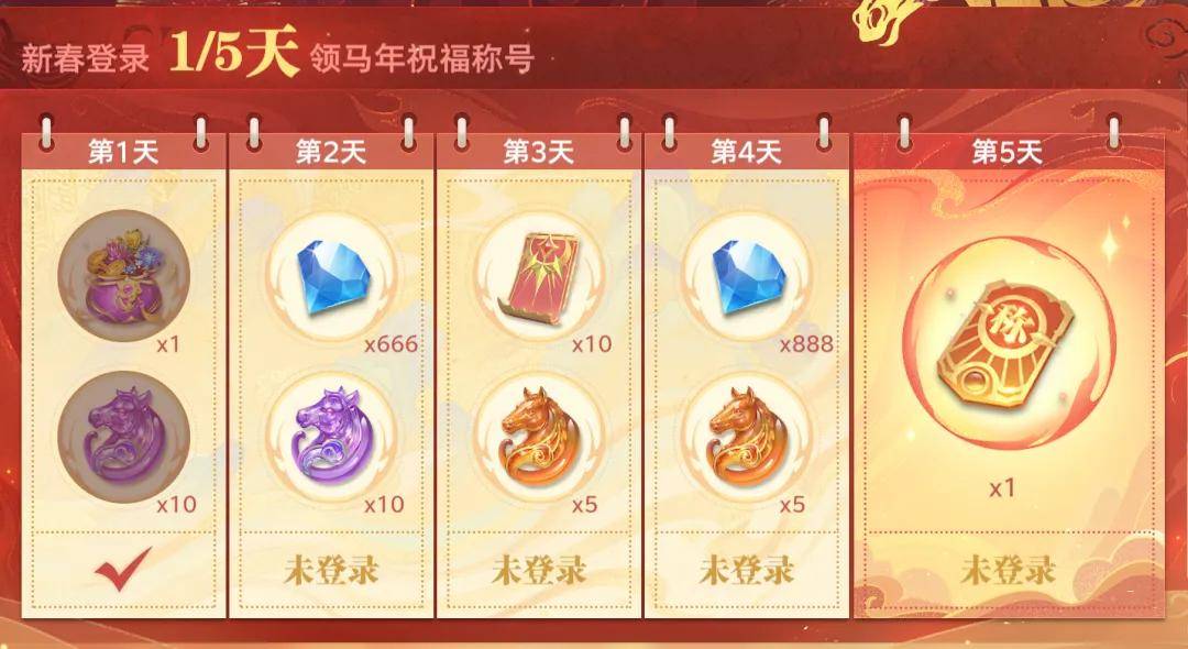 首先是第一个登录活动,总计5天可以领取到1554钻石+10武魂觉醒券+一个马年称号+10个高级兑换玉和20个中级兑换玉,外加一个仙草的自选,因为是免费的缘故,所以这个登录活动吧也还行。