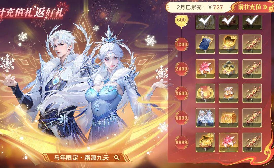 接着猛的来了......2月的累充活动,这个活动最高有9999元的累充档位,隔壁魂师对决的6666元珍珑阁活动看了都有点瑟瑟发抖的感觉,哈哈,那么这个累充嘛真就是大家量力而行了,其中皮肤得6000元才能获得,总之就是此活动涵盖了整个2月,所以2月那剩下几天的其它活动吧也可以再看看再说。