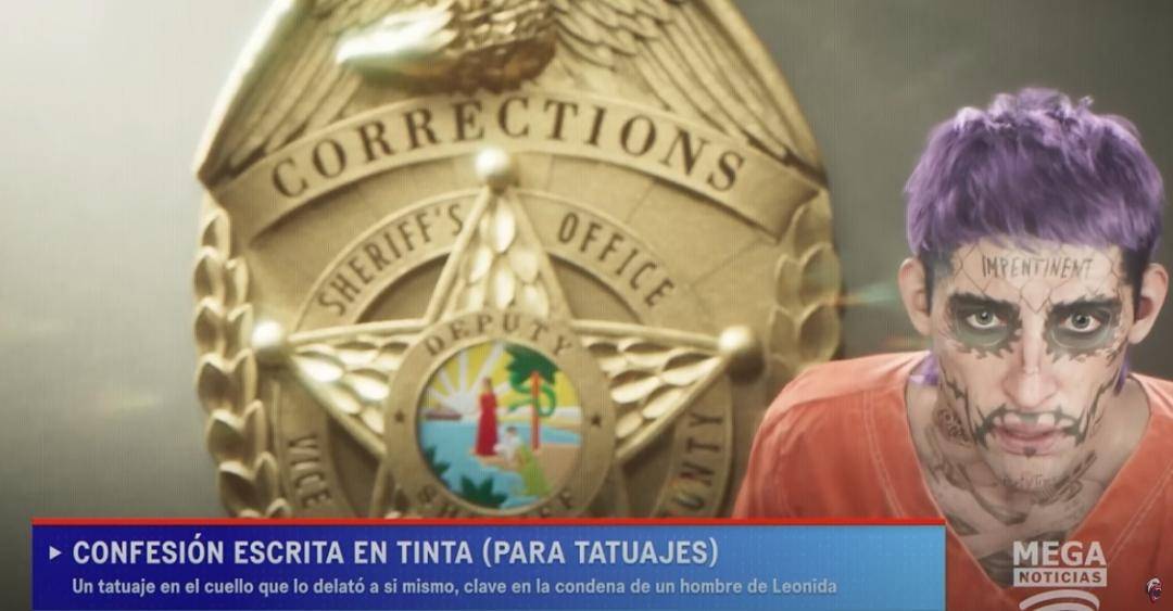 比如预告片里的一幕镜头,一名紫色头发,满脸纹身的男子出现在电视上。