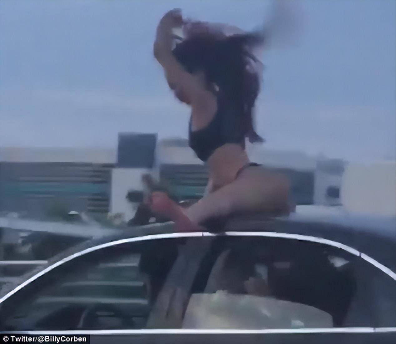 2017年,有人在迈阿密的麦克阿瑟堤道上拍到了一位女士坐在车顶跳电臀舞。