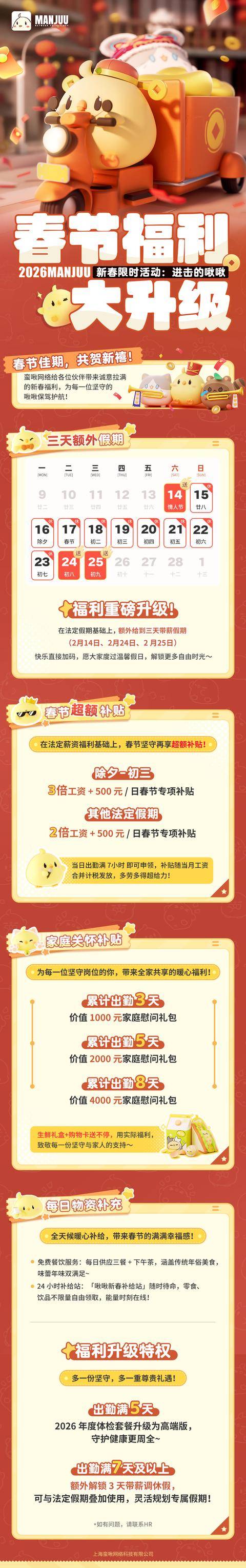 拿最近的春节来说,蛮啾本身有游戏圈子里第一梯队时长的放假时间,整整12天,但实际上肯定不可能全员停摆不管项目,所以他们不止表面上的“热闹”,针对那些春节需要留守的员工,蛮啾不但准备了3倍工资,还有时长解锁的高额福利奖励+后续调休。
