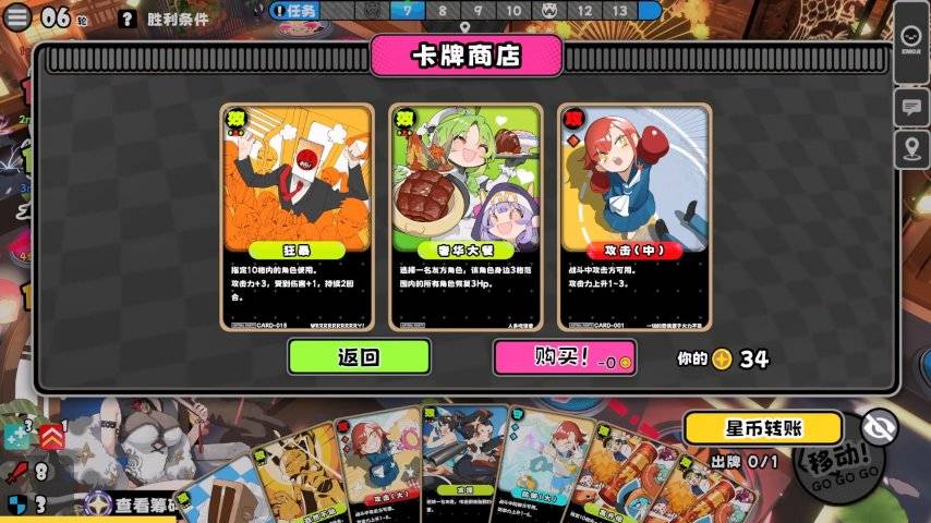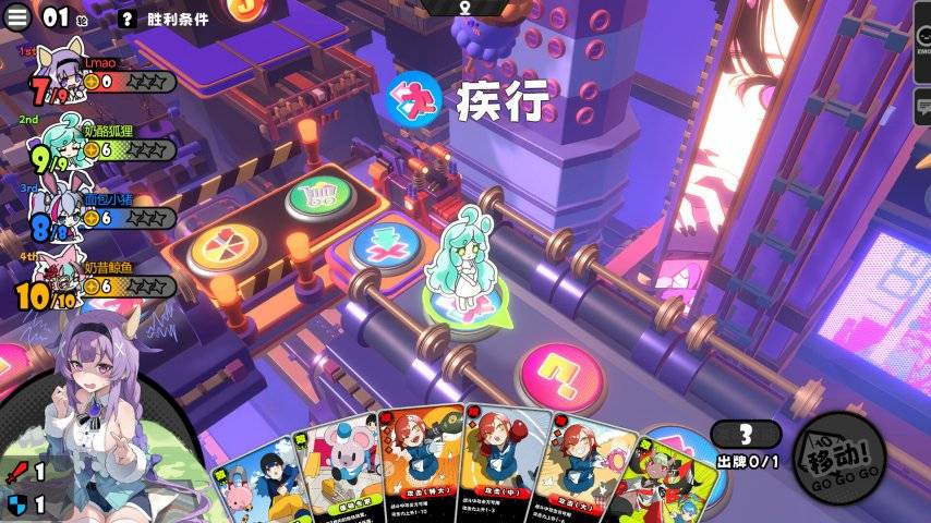 游戏不仅包含基础的跑图环节,还引入了激烈的卡牌博弈与战斗机制,玩家可以通过使用各种功能卡牌来干扰对手或强化自身属性。目标是通过各种策略手段积累足够的星币并升级,最终达成胜利条件。每局游戏都充满了由于随机事件和卡牌互动带来的不确定性。