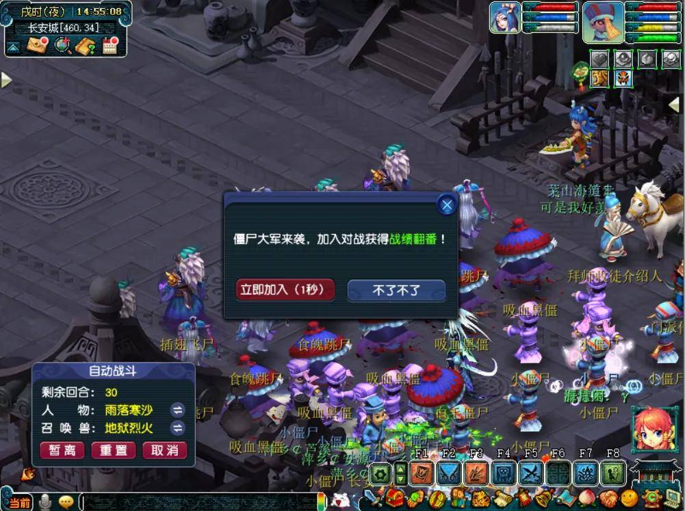 如果想要快速升级,可以加入“万鬼集结令”玩法。活动期间,每个小时55分时,长安城(465,28)附近将出现僵尸阵列队伍。僵尸阵营加入其中可以获得积分翻倍、进阶战将等福利,道士阵营则可以趁机刷战绩。