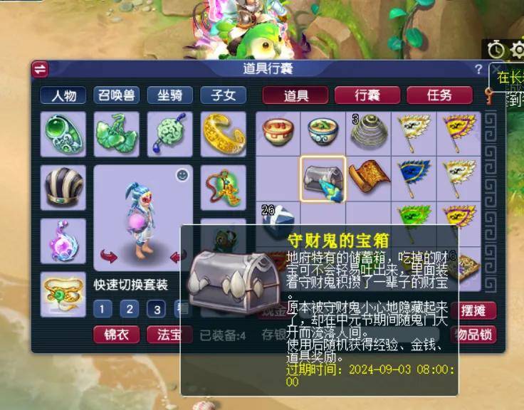 在刷环任务时,大家可以获得“守财鬼的宝箱”,内含经验、随机物品、储备金等奖励,建议攒多了一起开。