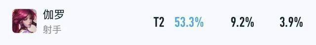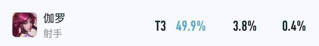 在巅峰赛里,伽罗仅有3.8%出场率,胜率也没有突破50%,排在发育路的倒数第三。