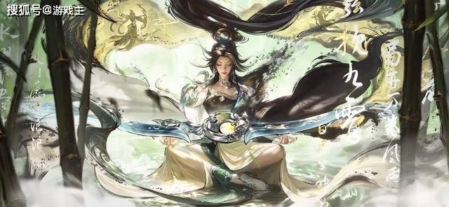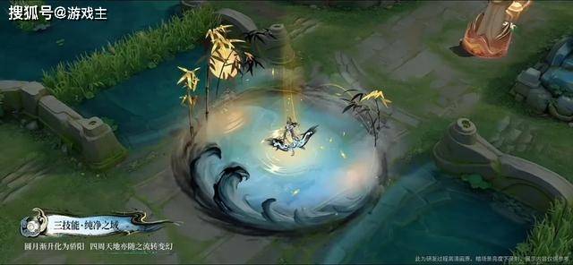 三技能铺展水潭法阵,四周竹林掩映,潭中浮现神女画像,空中圆月还会逐渐变成骄阳,竹子的颜色也随之变化。