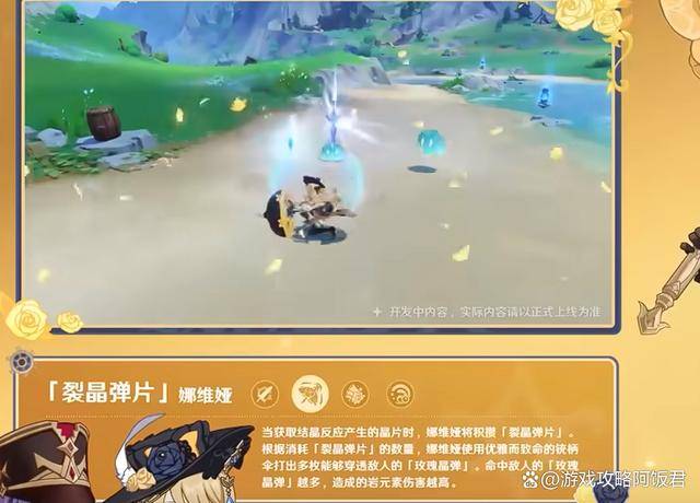 所以根据这些特点咱们不难看出,娜维娅的配队比较倾向于双岩+另外两个异色。比如双岩+水神+班尼特。这样既有充足的结晶反应,让娜维娅攒buff,同时自身天赋的加成也是可以吃满的。
