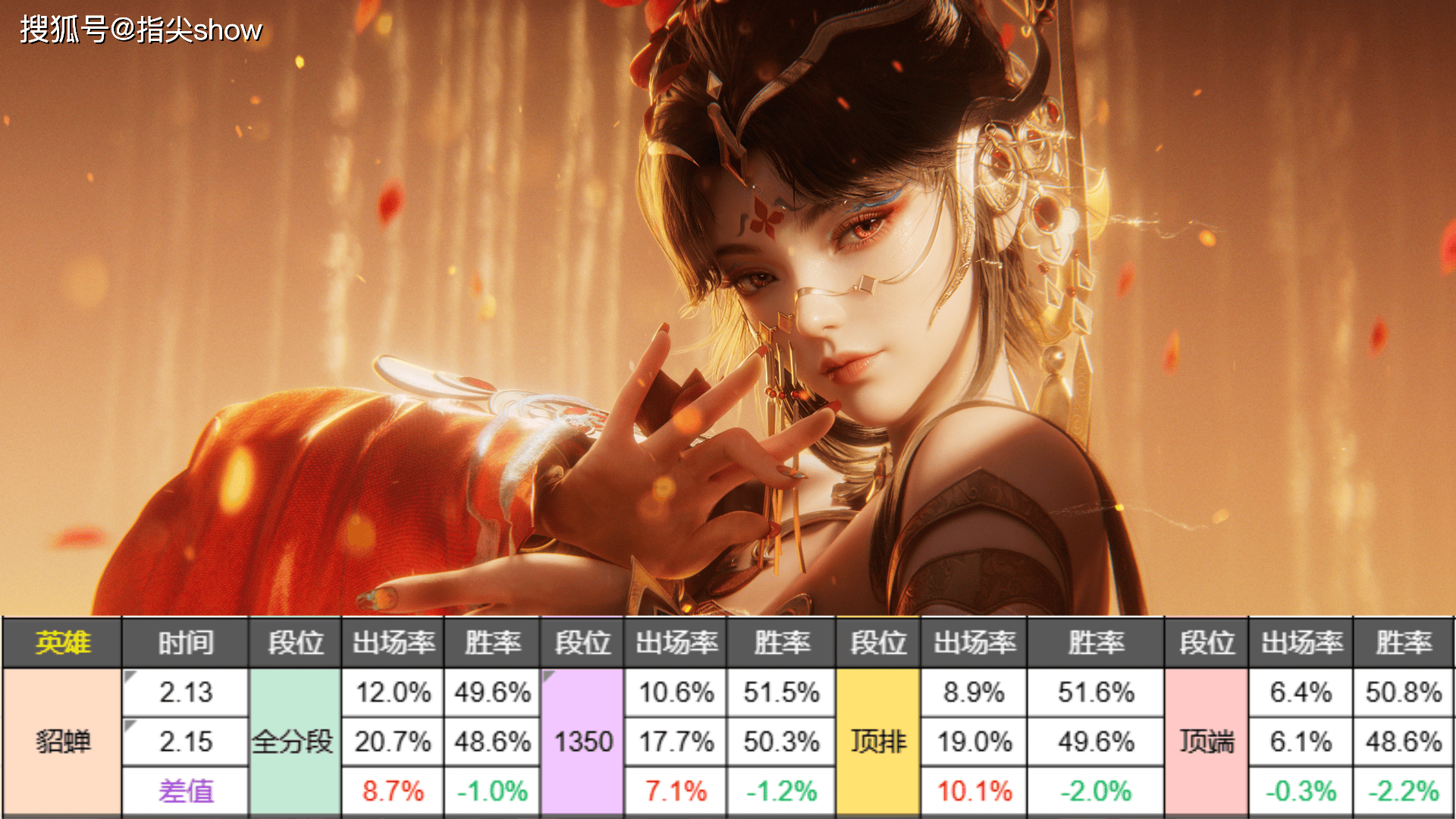 要说最奇怪的可能就是貂蝉了吧,朵莉亚顶端局还带有接近1%的涨幅,貂蝉顶端局甚至不升反降,这有点反常识。