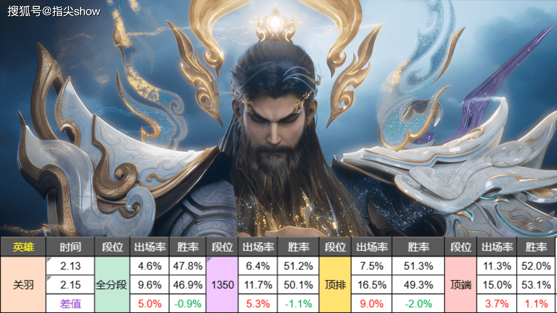 关羽的情况和马超很像,都是低分段难以发挥,高端局常客,但不同的是,关羽顶端局涨了3.7%的出场率同时,胜率也涨了1.1%。