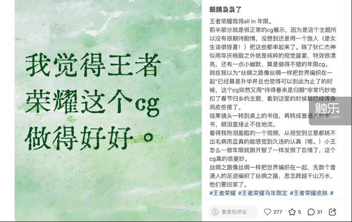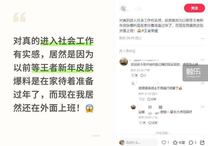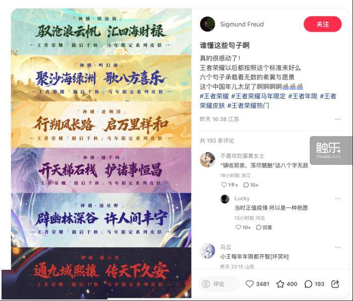这也是大部分《王者荣耀》玩家所共有的感受。我看到了不少玩家发出了和Lulu类似的感慨。从这个角度来说,每年的年限皮肤、春节活动甚至成为了一个锚定时间和情绪的锚点。对玩家来说,他们总是会和《王者荣耀》一起记住那些新旧交替的时刻。